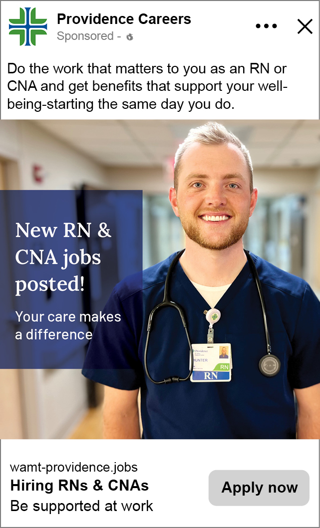 For Providence, we’ve run programmatic campaigns in places like Alaska, Texas, California, and Montana. Each campaign is tailored to its audience—whether it’s nurses, clinic staff, or post-acute care professionals. Using data, we’ve been able to refine advertising creative to get the best results.